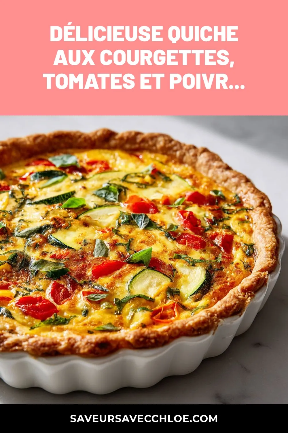 Une quiche colorée et généreuse avec des courgettes, tomates et poivron, parfaitement équilibrée, idéale pour un déjeuner ensoleillé ou un dîner léger.