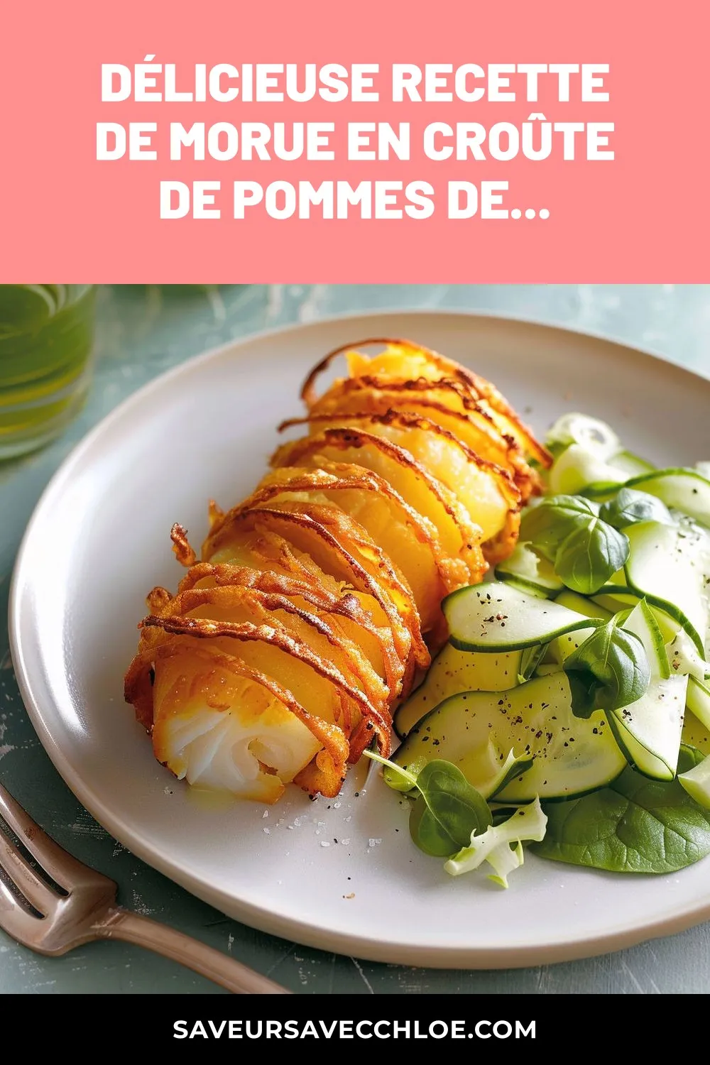 Pour une présentation créative de ce plat de morue enrubannée de pommes de terre, vous pourriez disposer les pavés de morue croustillants au centre de l’assiette, entourés de spirales de pommes de terre. Ajoutez une touche de fraîcheur en disposant joliment la salade de concombre croquante sur le dessus de la morue. Pour une touche de couleur supplémentaire, saupoudrez le tout de basilic frais ciselé et de quartiers de citron. Servez avec des mini frites de pommes de terre en accompagnement pour une présentation ludique et conviviale.