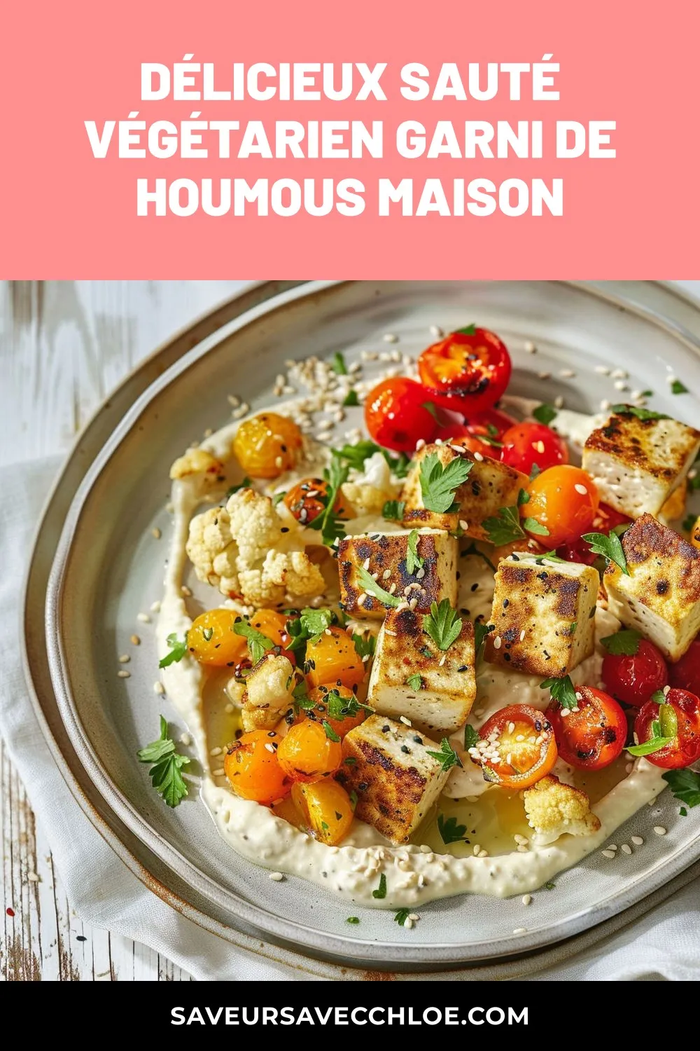 Délicieux sauté végétarien garni de houmous maison